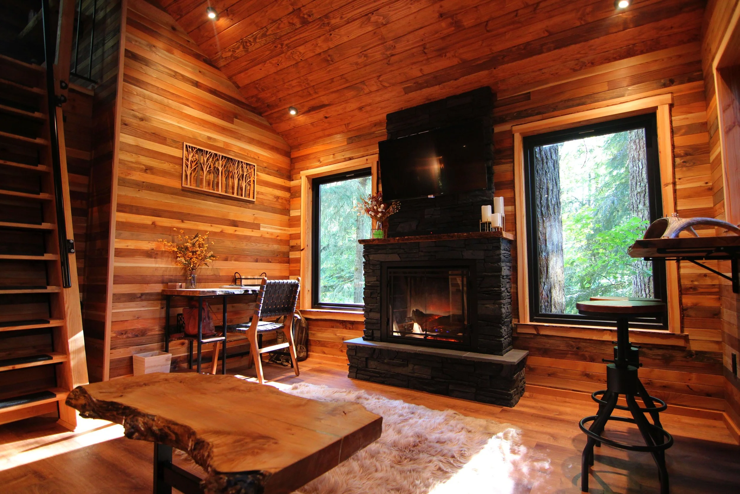 A private parking area greets our guests, and is EV friendly with a 120v/20 amp power source at the parking area for charging. A natural, lighted path leads guests 15 feet up to the deck, where they are welcomed in by one of our 100-year-old supporting trees. Inside, guests will find a fully functional kitchen (complete with a sink, range, mini-fridge, microwave, and convection oven). Peering into the living room, you will be immediately submersed in the beauty of the forest all around. Read a book in the suspended net loft upstairs, cozy up in front of the fireplace, stream your favorite shows on the integrated flat screen TV, or channel your creativity at the writing desk. The treehouse also features a full bathroom- complete with a waterfall shower- the perfect way to relax after a long day adventuring. At night, let the trees gently rock you to sleep in the queen bed upstairs- nestled 25 feet above the forest floor.
