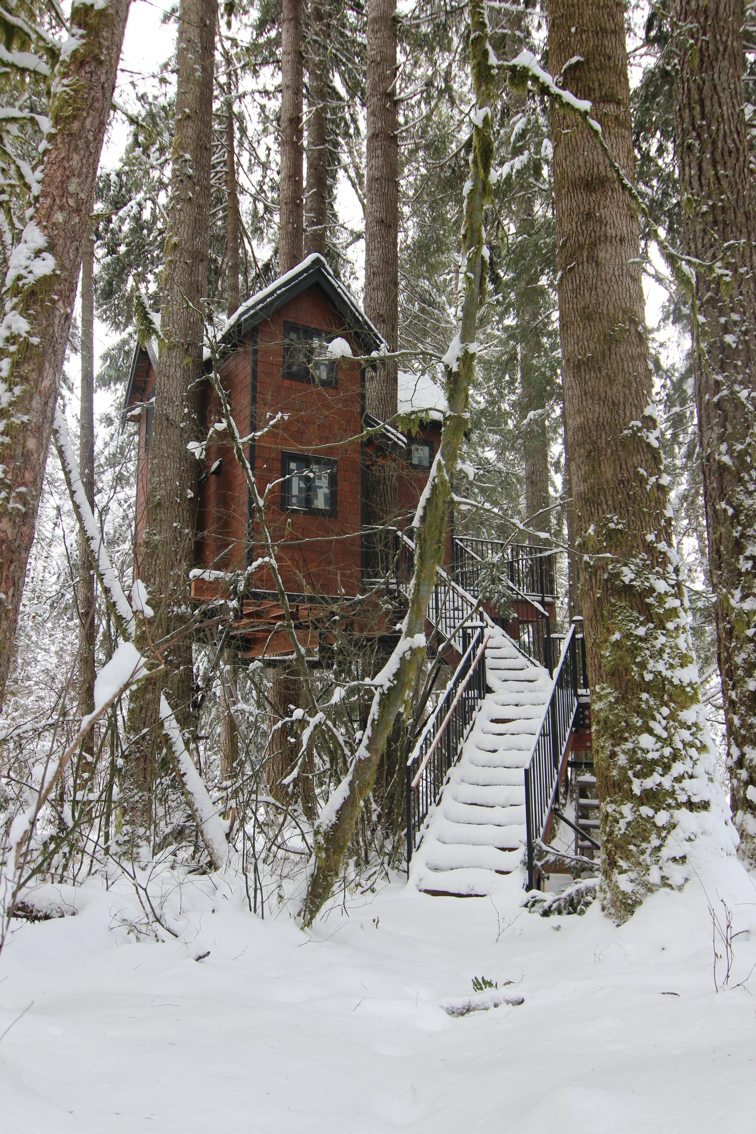 Iron & Vine Treehouse is fully permitted luxury treehouse in Ashford, WA offering short term vacation rentals for guests. Located just minutes from Mt. Rainier National Park and Paradise/Longmire, Iron & Vine provides guests a perfect setting for their mountain adventures. The 400 square foot treehouse is constructed in 4 massive Douglas Firs, and is situated as the sole structure on a half-acre of natural forest. The treehouse is designed in every way to work with nature, both to preserve the natural integrity of the forest as well as provide a safe, comfortable sanctuary so guests can experience the forest in a way that only a treehouse can provide. The treehouse was built as a model of eco-friendly and low impact development- providing all the amenities you would expect in a luxury getaway while preserving the surrounding natural ecosystem.